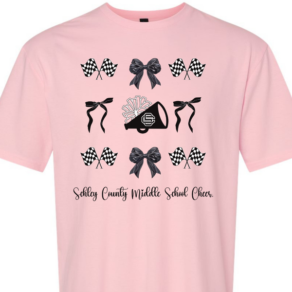 Show your school spirit with the Schley County Middle School Cheer Shirt featuring a stylish black and white checkered flags, megaphone, and charming coquette bow design. Available in light pink or gray, this shirt combines comfort and team pride, making it perfect for both game days and casual wear. Crafted with quality materials, it offers a soft feel and lasting durability, ideal for active students and cheerleaders who want to support their team in style.